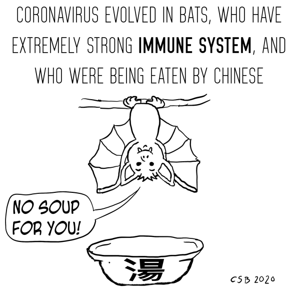Categories cartoons bat soup Post author By CSB Post date February 16, 2020 No Comments on bat soup Share this: Click to share on X (Opens in new window) X Click to share on Facebook (Opens in new window) Facebook Like Loading... Tags China, health, pandemic ← brexit emboldened racism → Donny doesn’t like bozo no more Leave a comment Cancel reply Δ