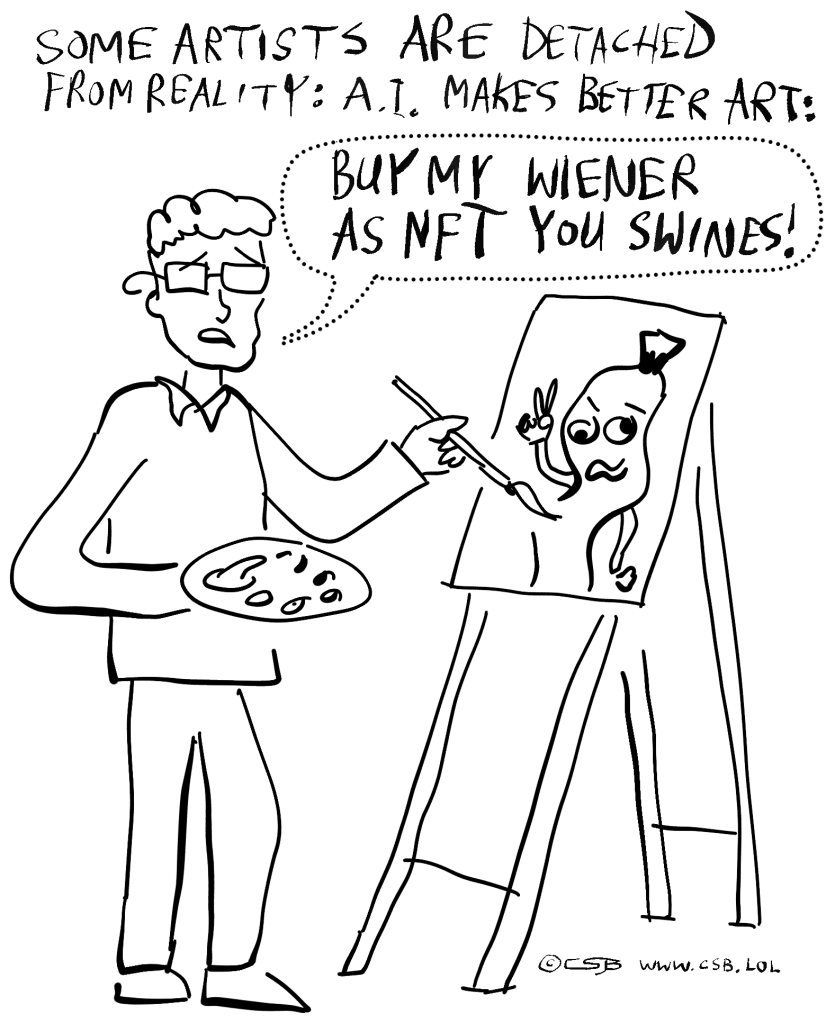Categories cartoons A.I.-generated art better than human-made Post author By CSB Post date July 30, 2022 No Comments on A.I.-generated art better than human-made Tags Artificial Intelligence, NFT, NFTs