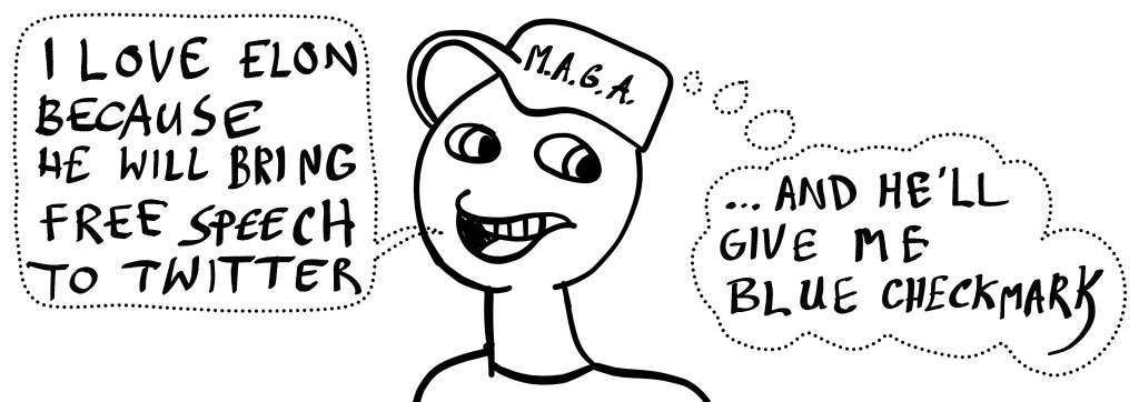 Categories cartoons why MAGA loves Elon Post author By CSB Post date November 4, 2022 No Comments on why MAGA loves Elon Share this: Click to share on X (Opens in new window) X Click to share on Facebook (Opens in new window) Facebook Like Loading... Tags politics, social networks, twitter ← Turkey and NATO and Finland → NFT marriage Leave a comment Cancel reply Δ